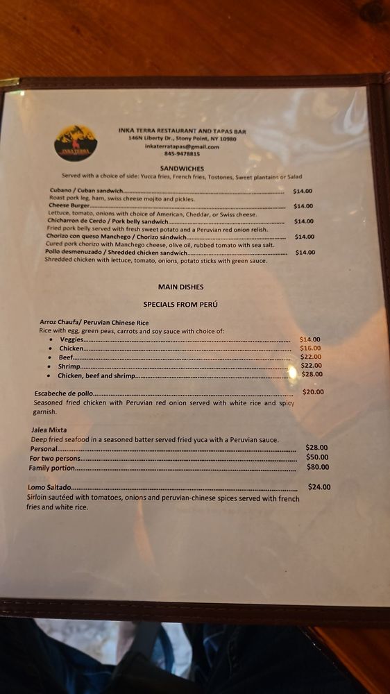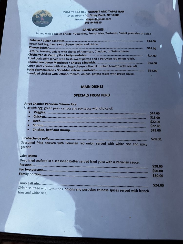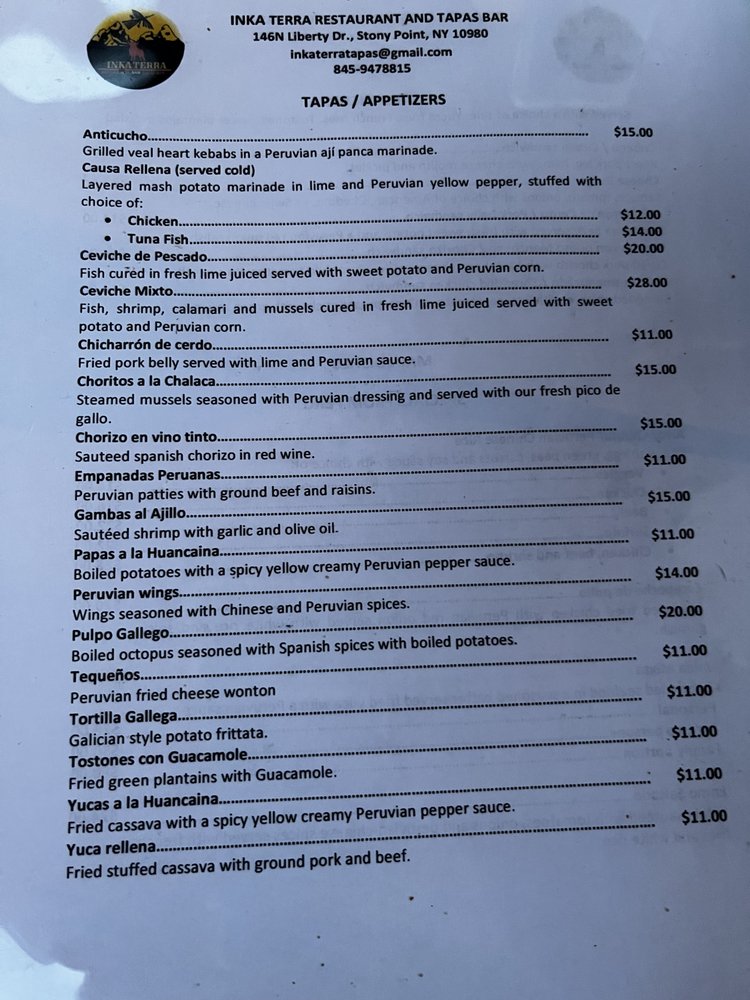 Welcome to Inka Terra Restaurant & Tapas Bar, a culinary gem nestled in Stony Point, NY. This Spanish tapas bar beautifully marries the comforting essence of Spanish cuisine with a vibrant Peruvian twist. The menu is a delightful exploration of flavors, featuring an array of fresh salads and enticing tapas. Highlights include the Gambas al Ajillo—sautéed shrimp infused with garlic and olive oil, and the Choritos la Chalaca, which pairs steamed mussels with zesty Peruvian pico de gallo.